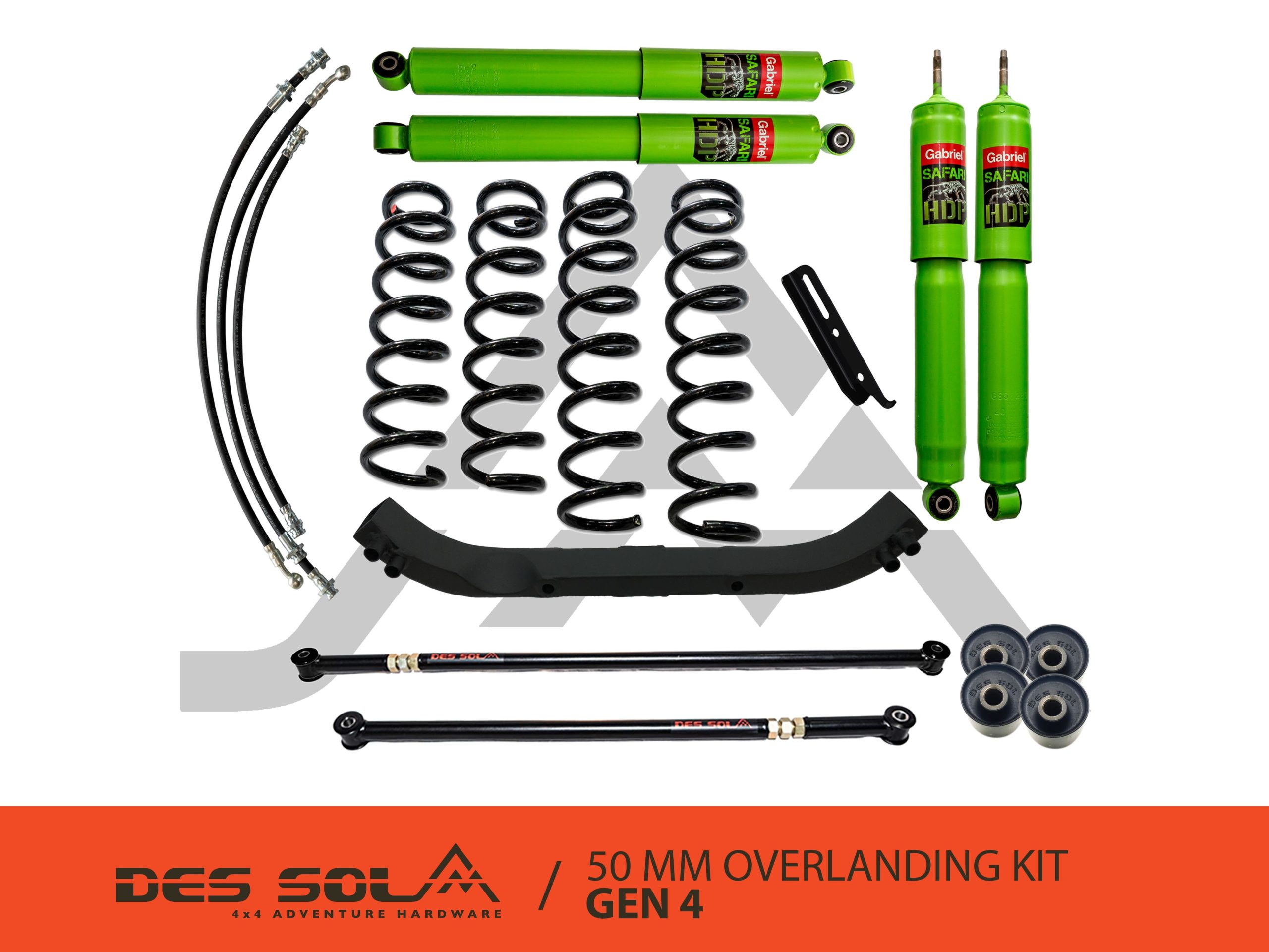 50mm Lift Kit Gen4 Pack 3 – Gabriel Shocks + Des Sol Springs + Des Sol Cross Member + Extended Brake Lines + LLSB + Castor Correction Bushes + Front Panhard Rod + Rear Panhard Rod